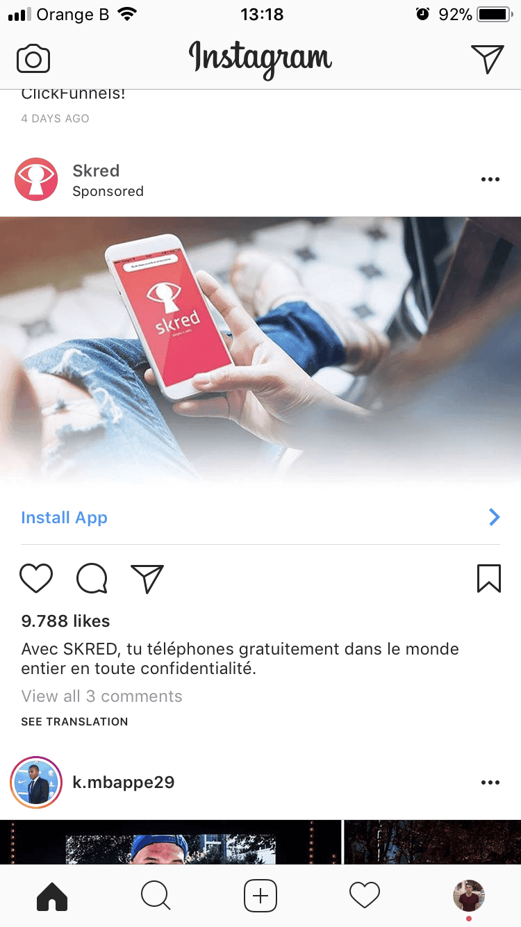 Les publicités Instagram peuvent s’afficher dans le fil d’actualité ou dans les Stories.