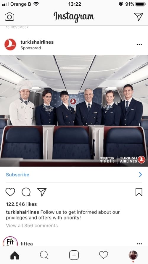 - L’image : même si le format n’est pas carré, il attire l’œil. Les personnes sont souriantes, l’ambiance positive. On comprend le message : voyager avec Turkish Airlines, c’est le plaisir et la bonne humeur.