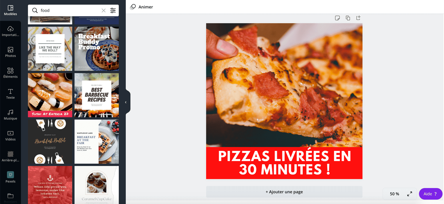 En quelques minutes, je personnalise un template, ajoute une photo de pizza bien appétissante et un texte accrocheur pour mettre en avant mon offre.