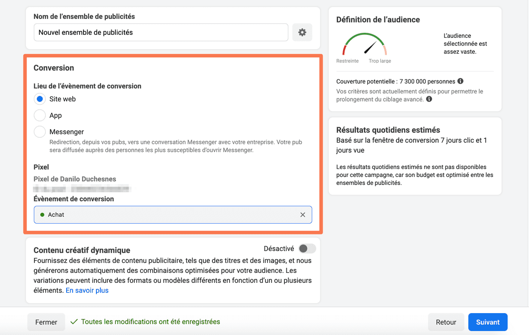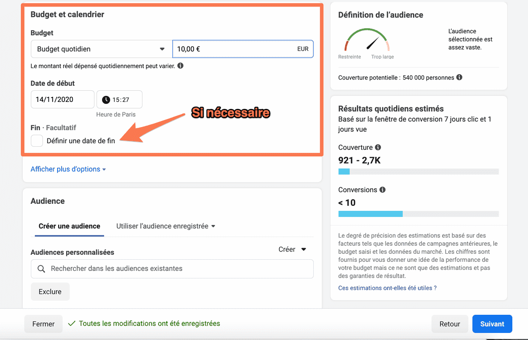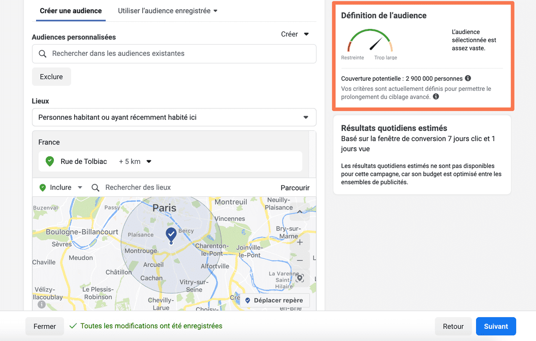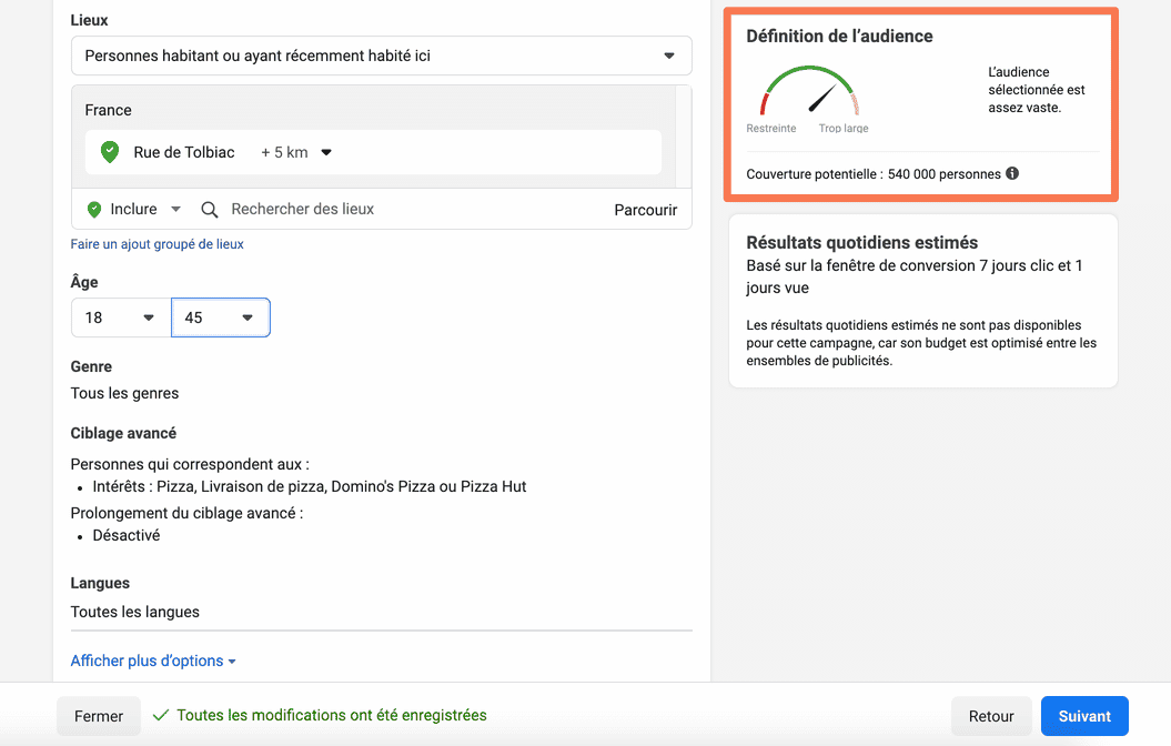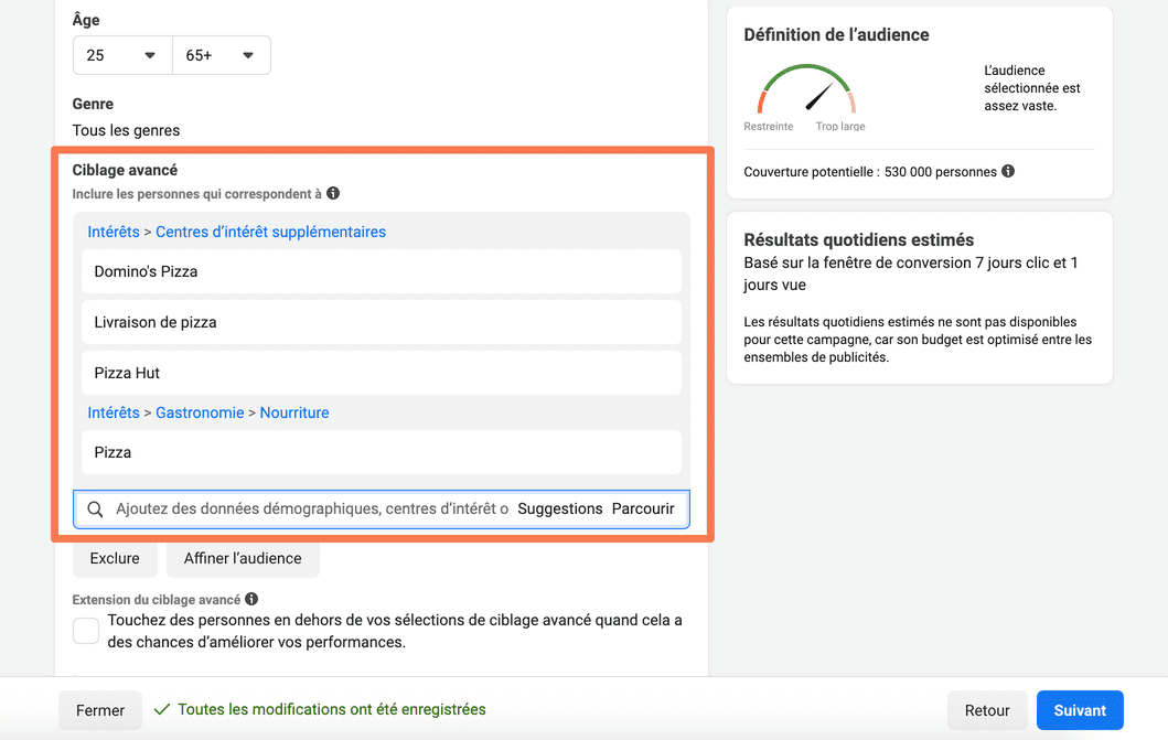 L’audience descend à 530 000 personnes (évitez de cibler moins de 300 000 personnes pour une campagne « conversions »).