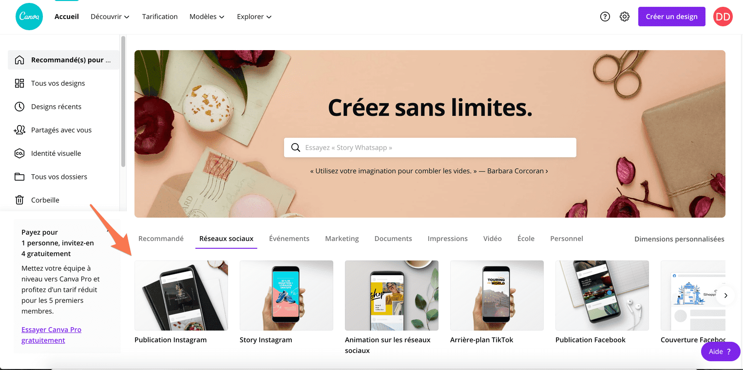 Je me rends sur Canva, outil gratuit et très pratique pour créer des visuels adaptés à chaque format.
