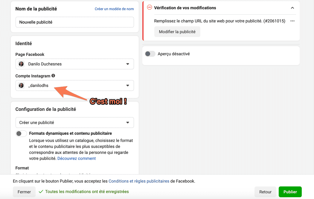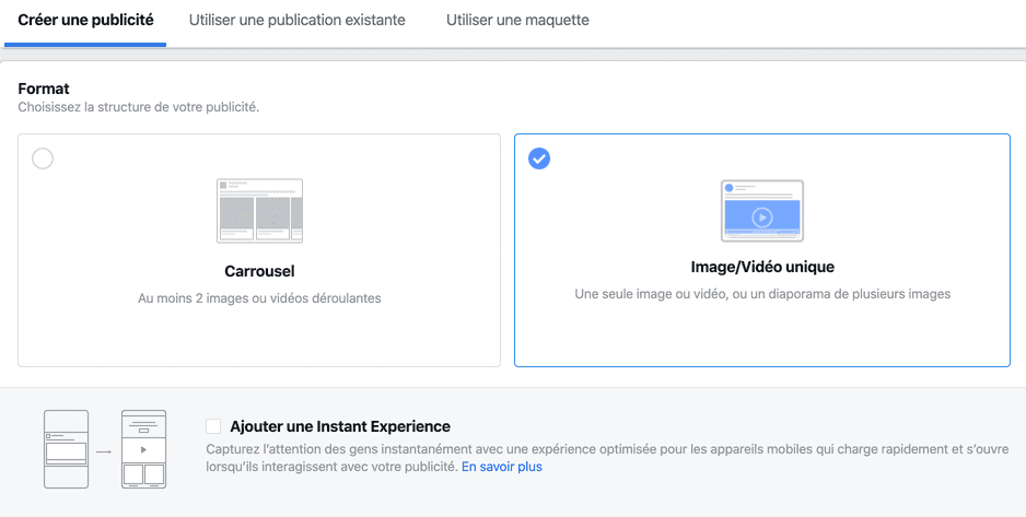 Je commence par choisir mon compte Instagram et le format d’annonce.