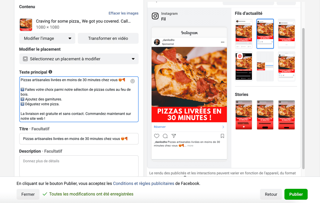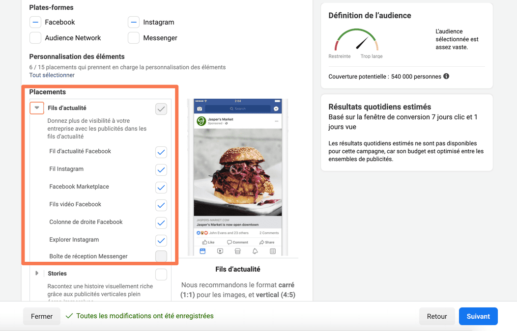 Pour cette raison, il est conseillé de ne pas exclure Facebook ou Instagram des emplacements disponibles, surtout pour les campagnes de conversion.